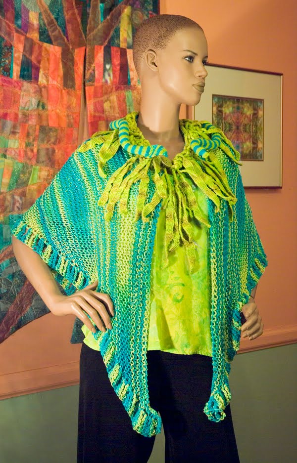 I wanted something big and dramatic to send to TNNA. I had just purchased Patricia Werners' "Dazzling Knits" and had to try it out. I had never made a mitered square before so I thought that by the time I finished something really big I should have it down pretty good. I used twelve colors using Blue Heron Beaded Wool, Beaded Wool Metallic, Softwist Wool and Silk/Merino yarns. It was great fun and took me about a month to complete. I used the basic square from her book.