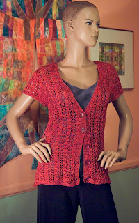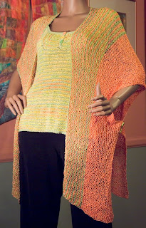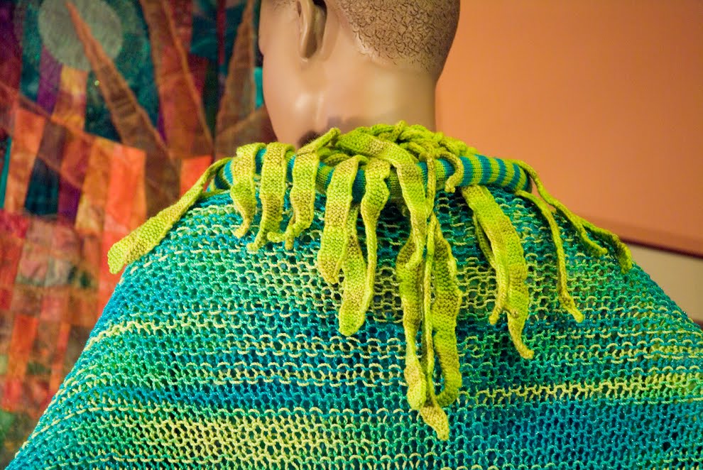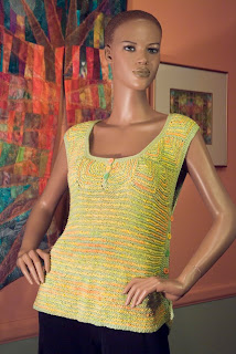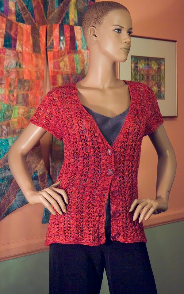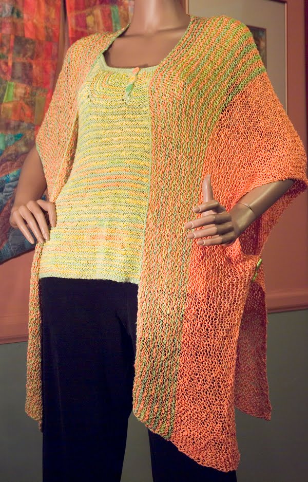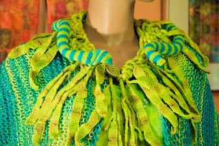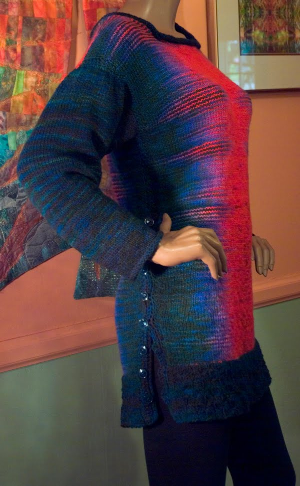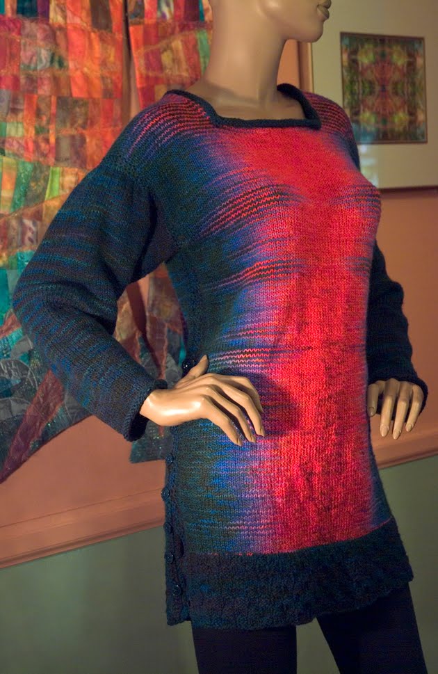 I wanted something big and dramatic to send to TNNA. I had just purchased Patricia Werners' "Dazzling Knits" and had to try it out. I had never made a mitered square before so I thought that by the time I finished something really big I should have it down pretty good. I used twelve colors using Blue Heron Beaded Wool, Beaded Wool Metallic, Softwist Wool and Silk/Merino yarns. It was great fun and took me about a month to complete. I used the basic square from her book.