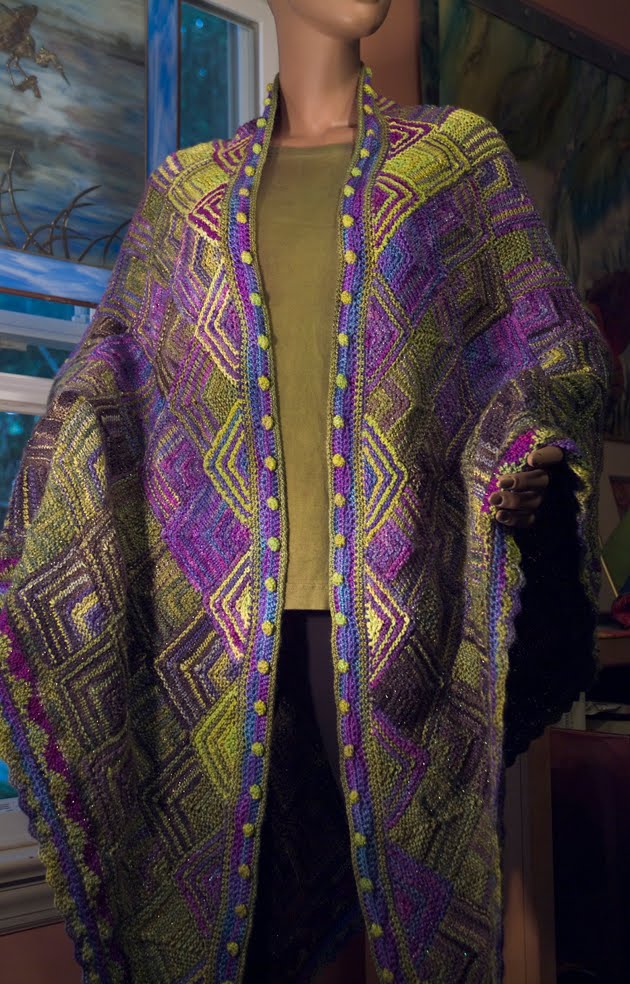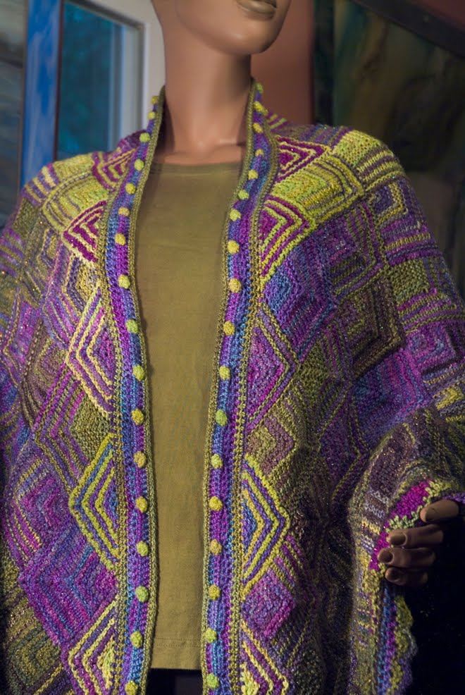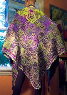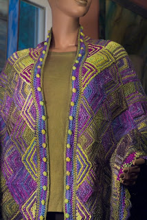 I wanted something big and dramatic to send to TNNA. I had just purchased Patricia Werners' "Dazzling Knits" and had to try it out. I had never made a mitered square before so I thought that by the time I finished something really big I should have it down pretty good. I used twelve colors using Blue Heron Beaded Wool, Beaded Wool Metallic, Softwist Wool and Silk/Merino yarns. It was great fun and took me about a month to complete. I used the basic square from her book.