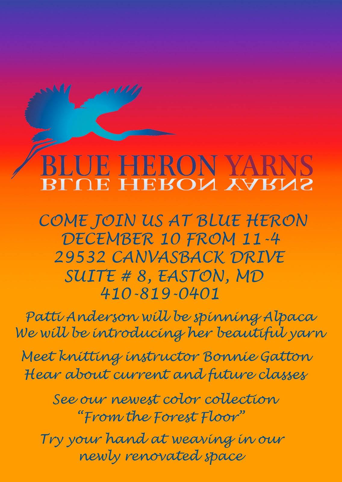 Call us for directions if you have not been to Blue Heron Yarns before.