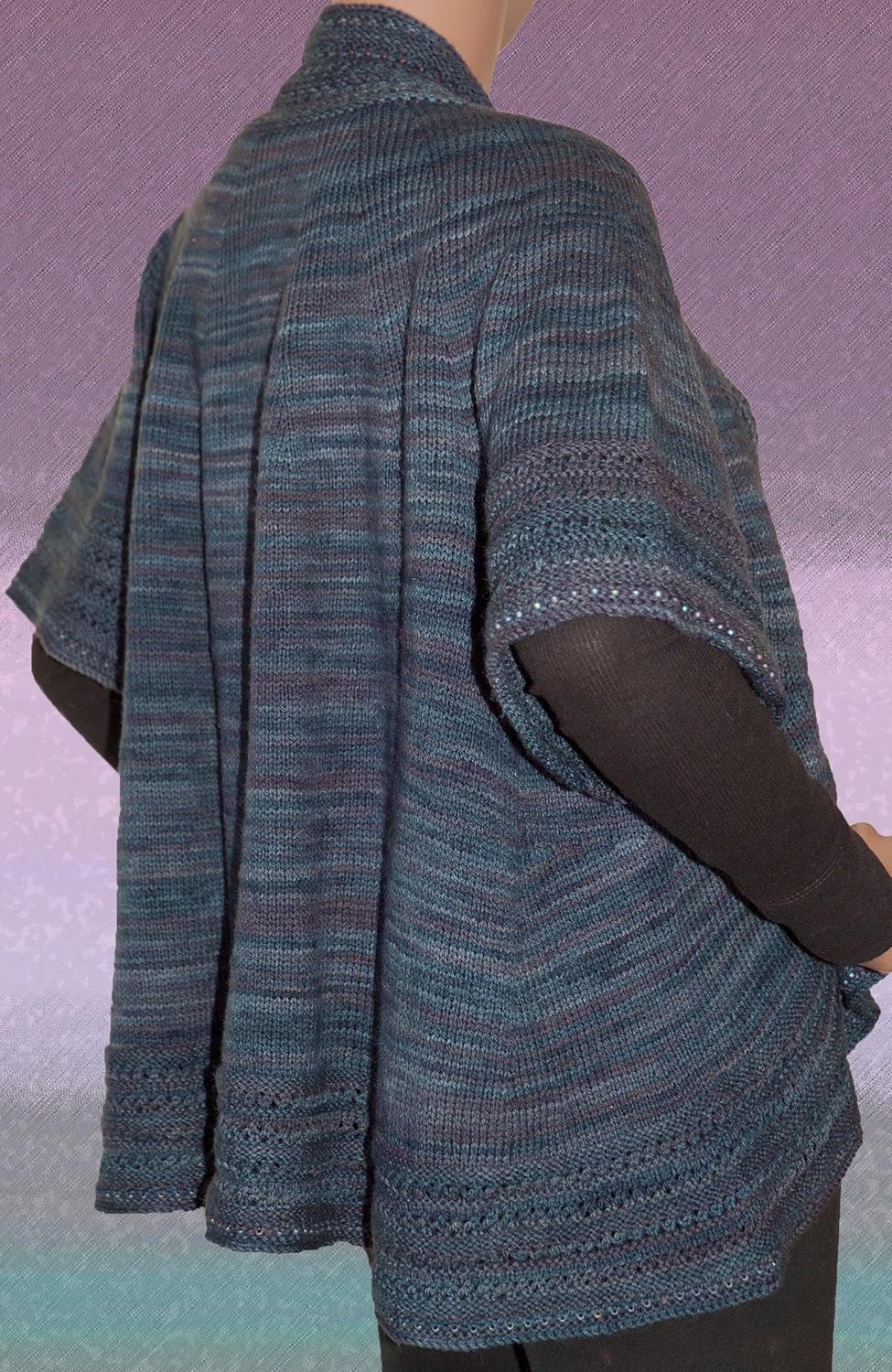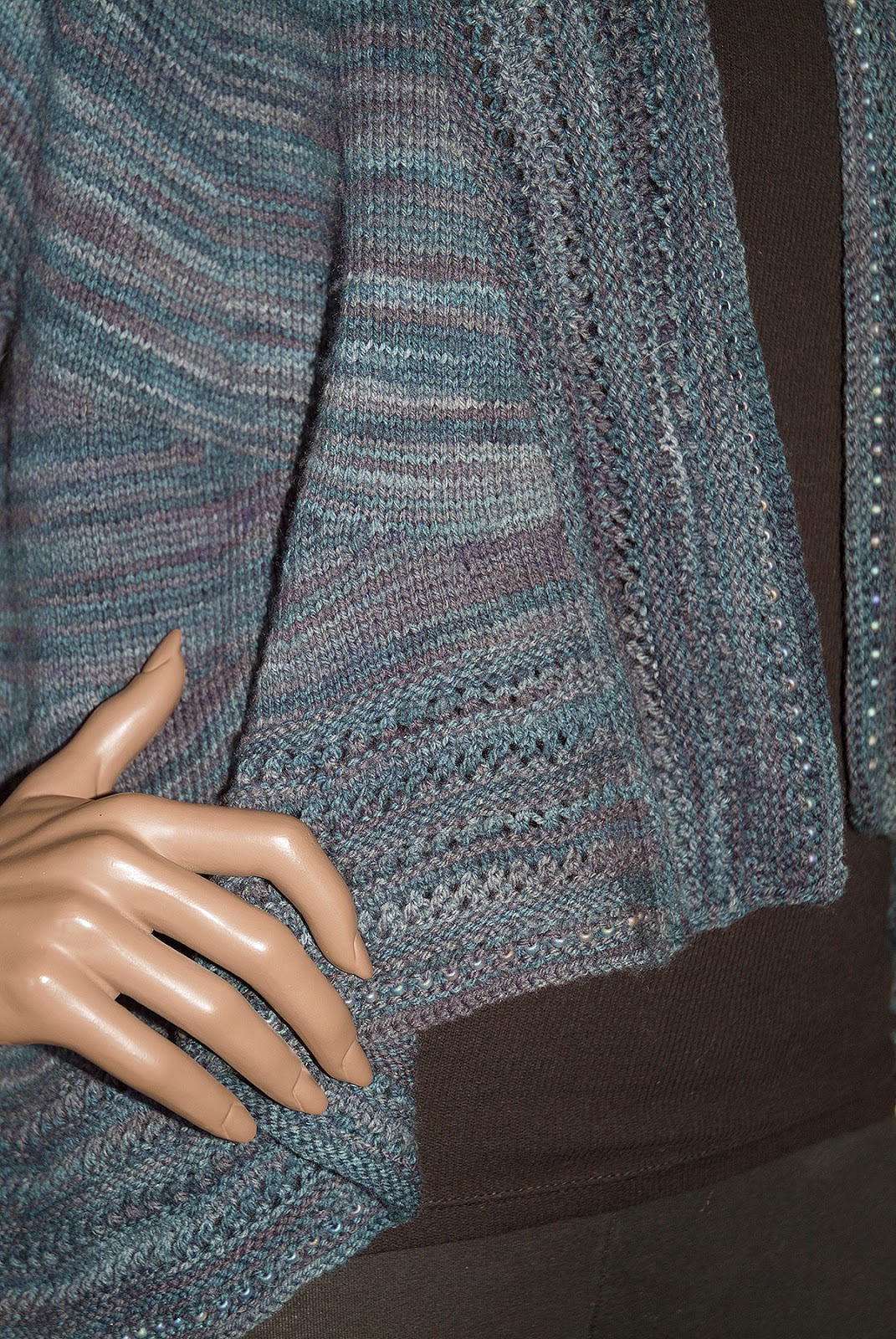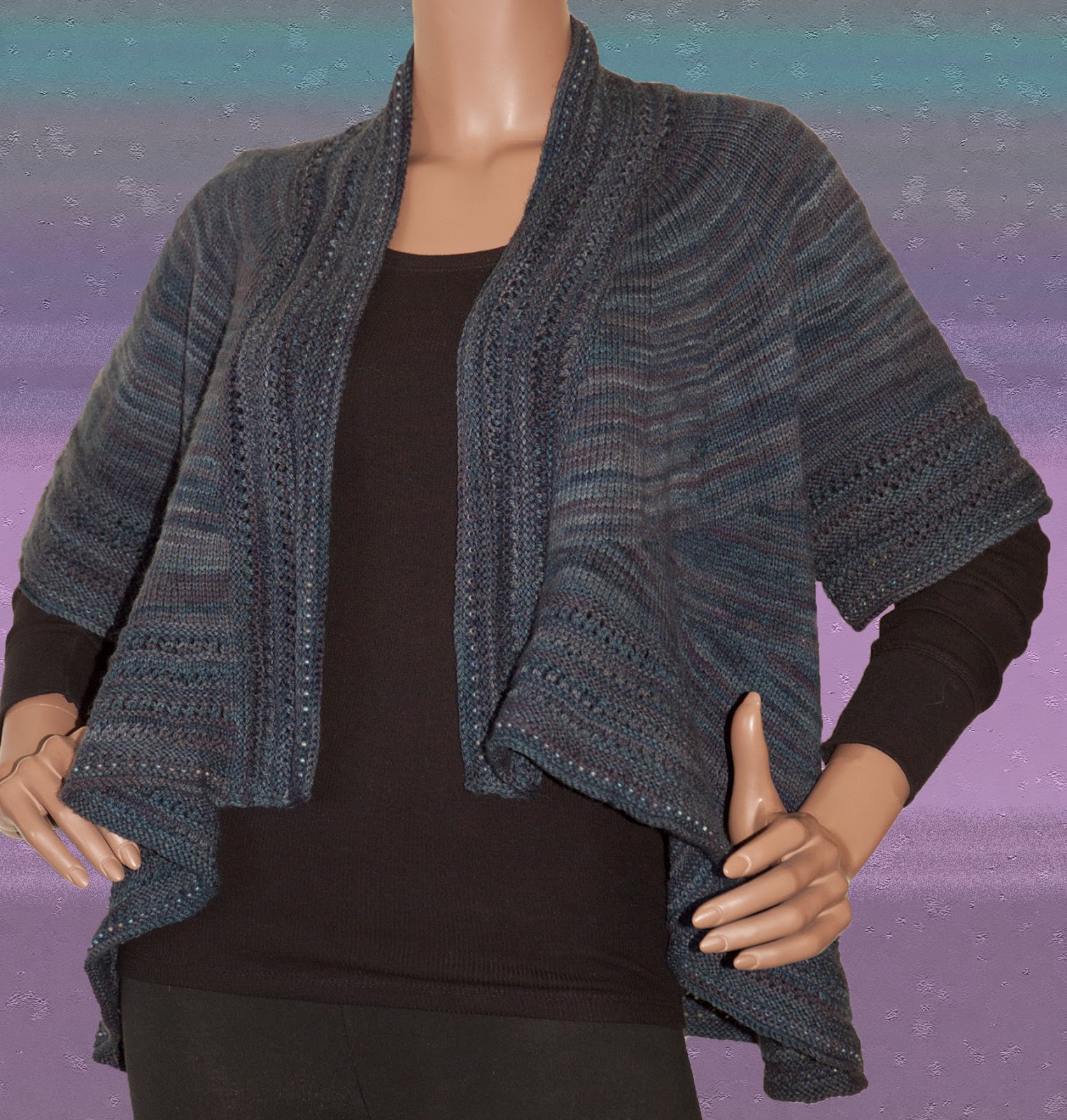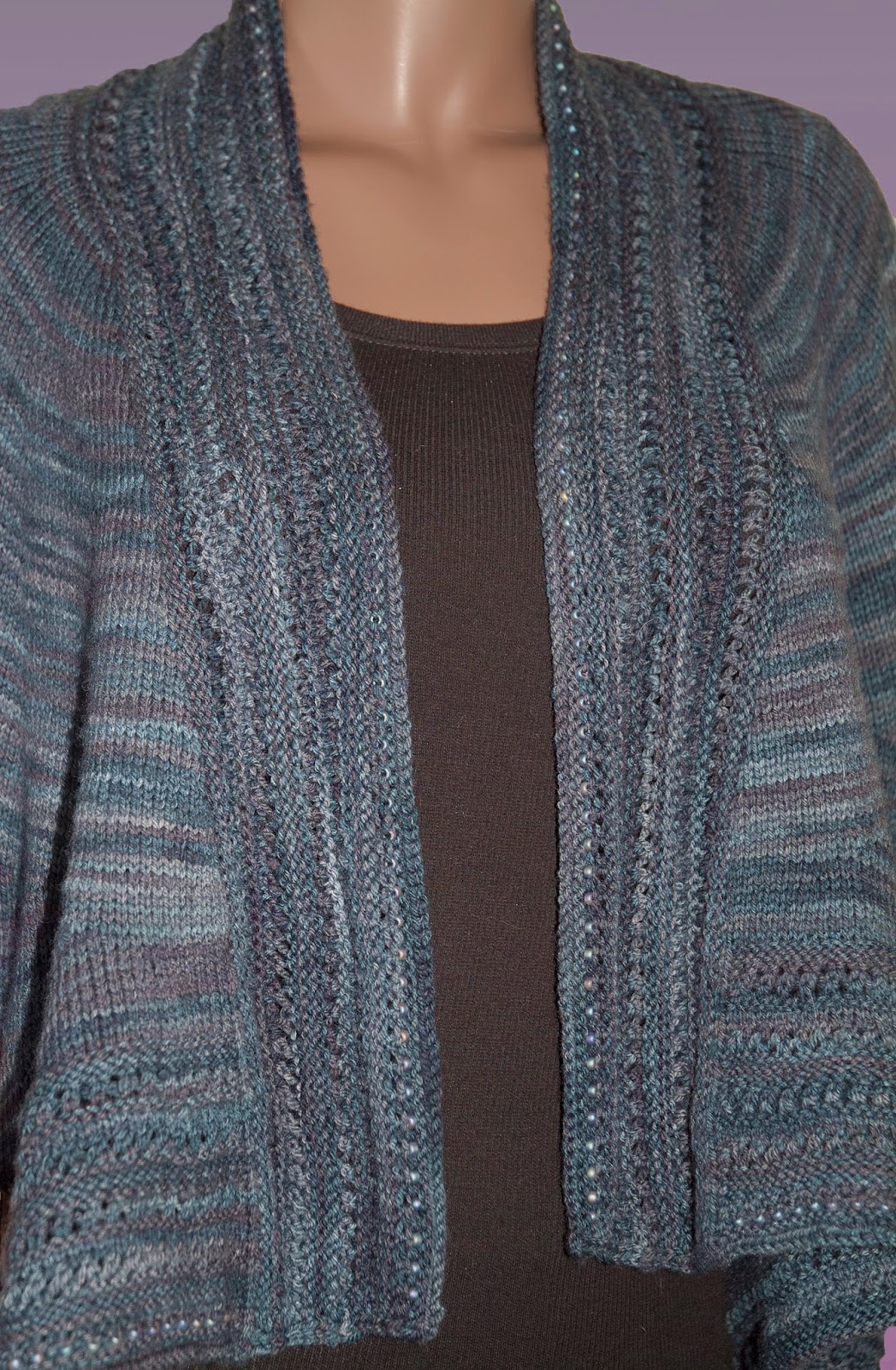 This beautiful jacket designed by Heidi Kirrmaier has been knit by expert knitter Judy Lewis, the newest addition to the Blue Heron team. It involves a lot of short rows and is best for a knitter with some experience. We did it in our Sock Plus yarn in the color "Deep Slate" and added beads. You will find it on our website in "Kits and Patterns". https://www.blueheronyarns.com/shop/yarn-kits-patterns/chance-showers