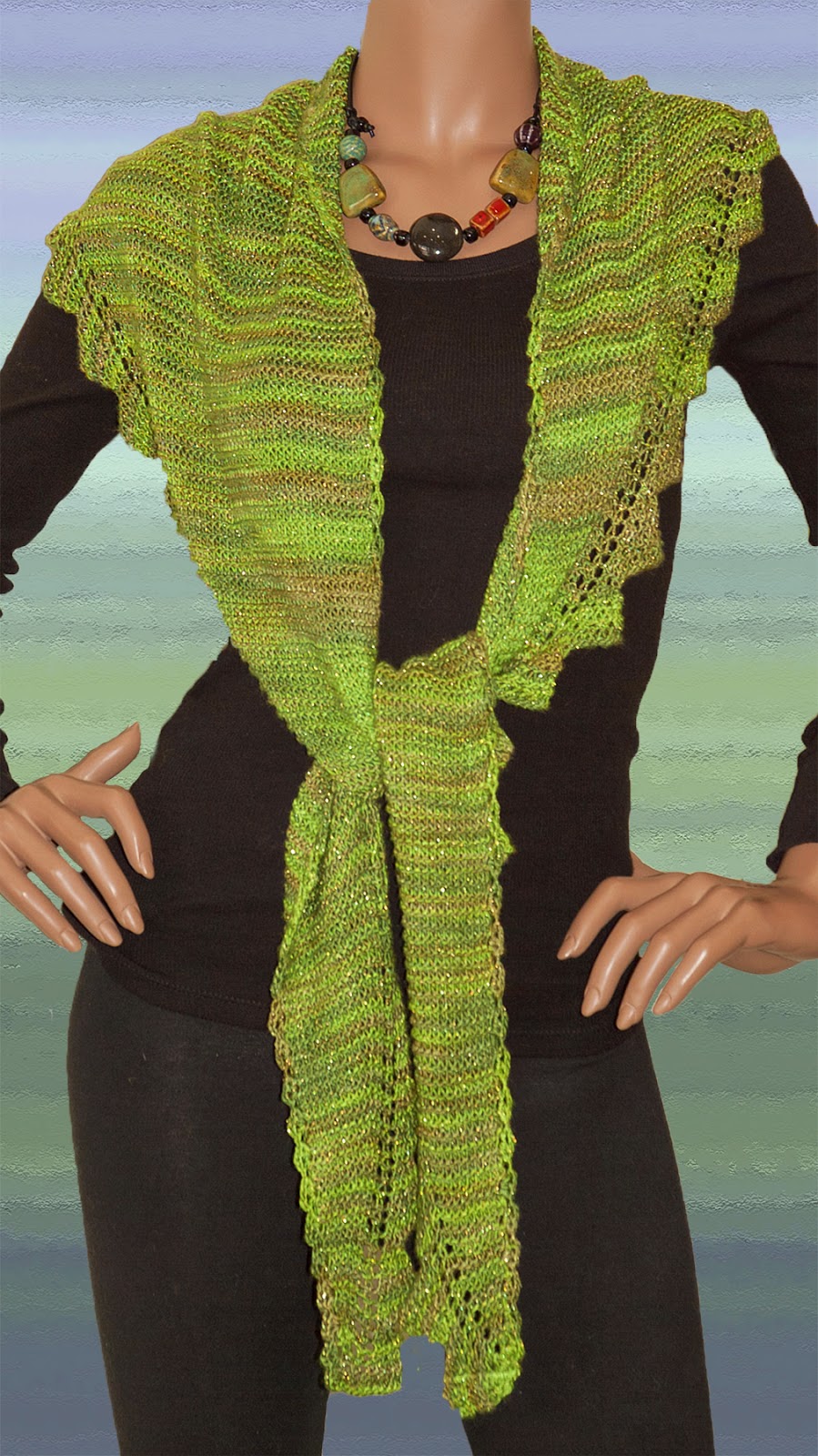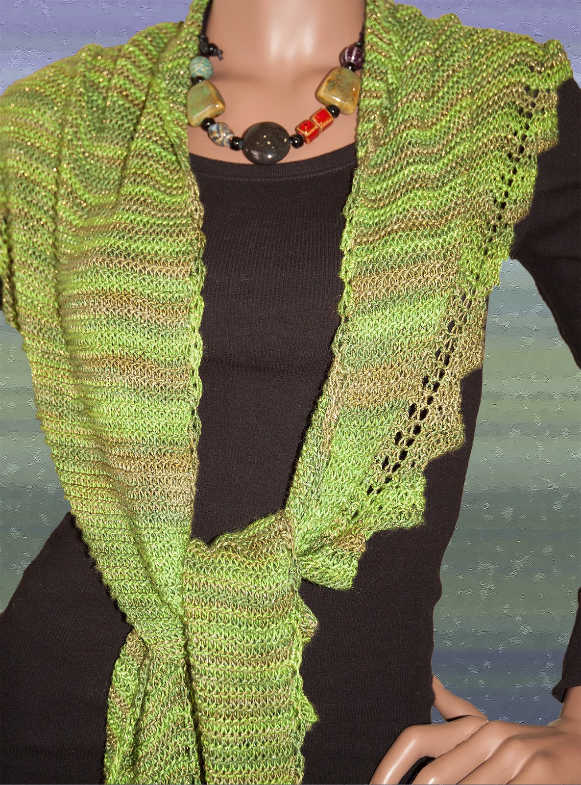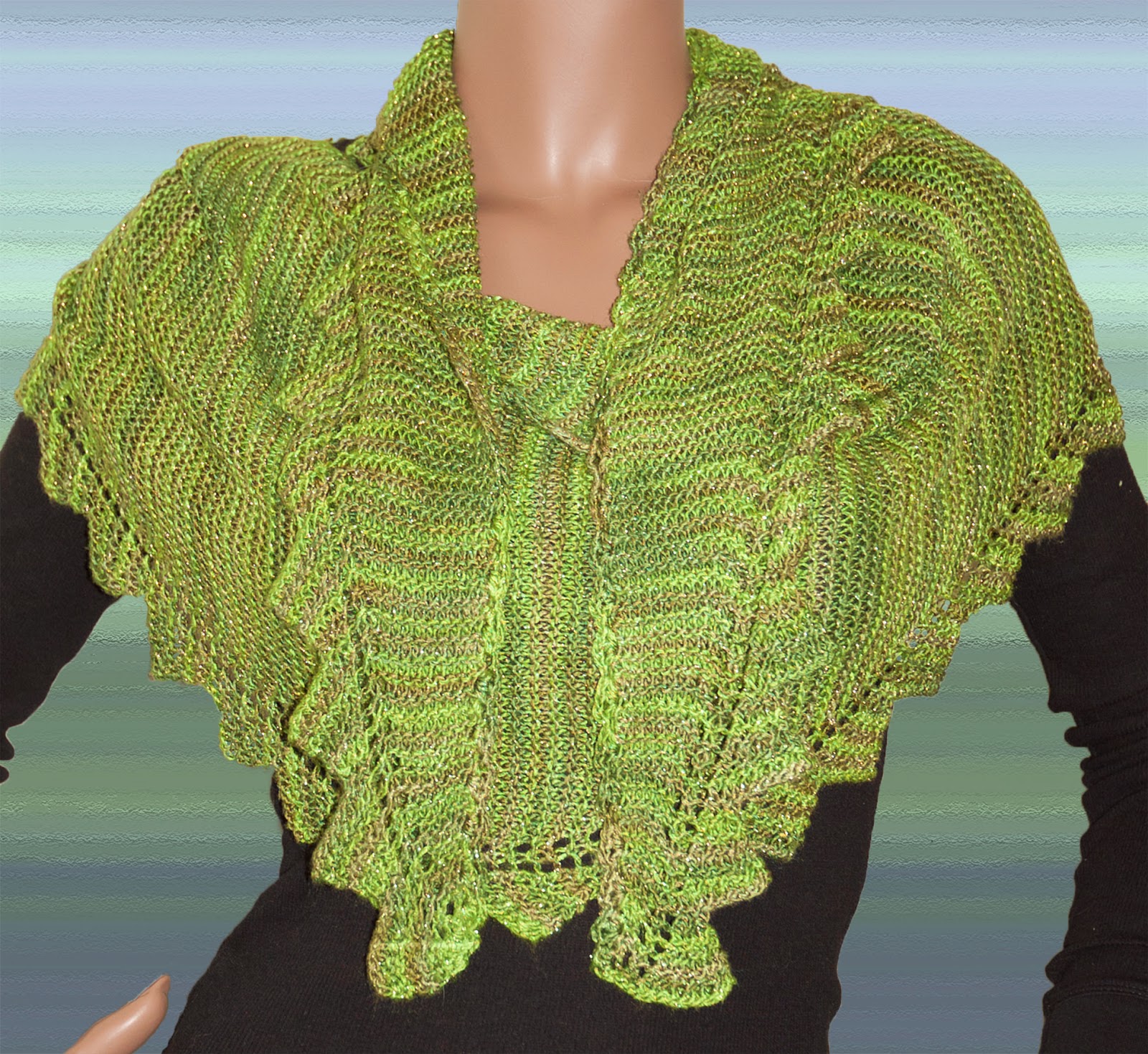 I have begun using other designers' patterns for some variety. It also lets me have time for other things. One of my favorite designs is the "Pimpelliese Shawl" by Christine Ebers. I have done this in several of our yarns. My latest one here is in our Rayon Metallic yarn in the color "Fern". I'm ready for spring so warm green is my color of choice. I used 1 skein and got a large shawl 72" long that drapes beautifully.