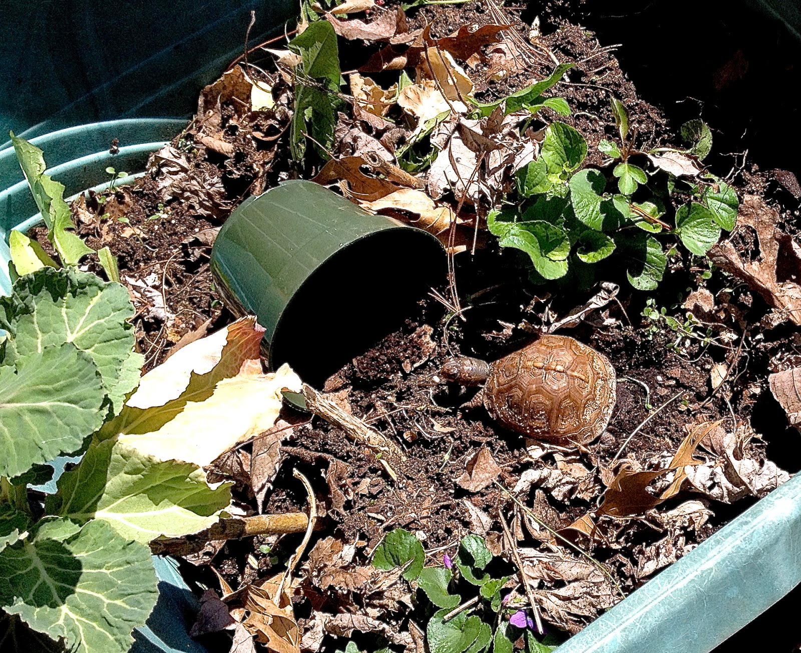 She hangs out in this planter to get some sun and hunt worms while I garden.