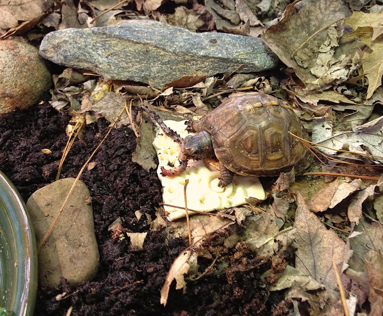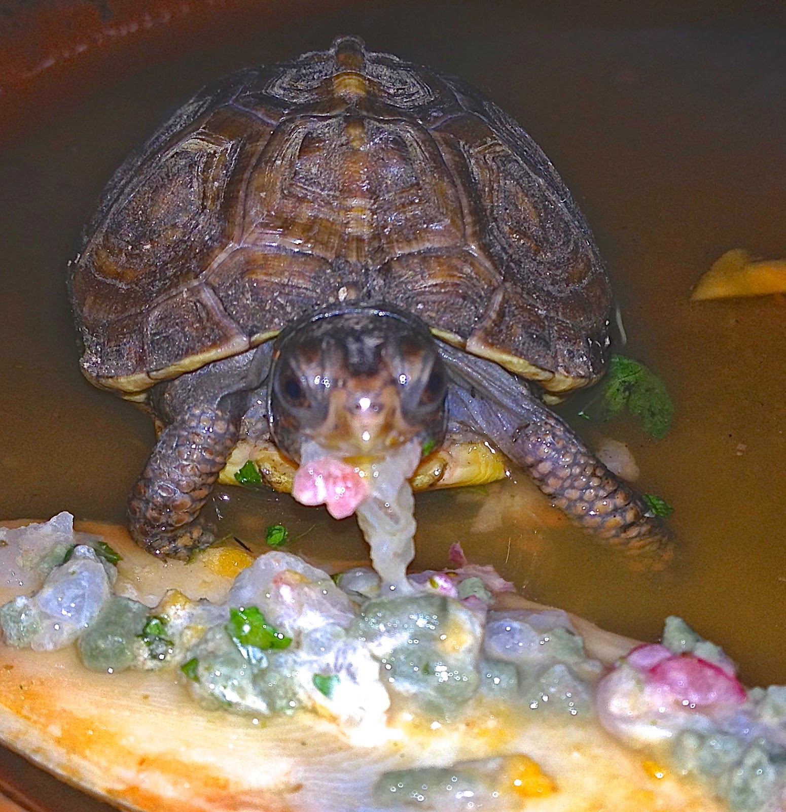 Here's an update on the baby turtle. She is now in her 8th month out of the nest and 2 3/4" long. She has a very healthy appetite.