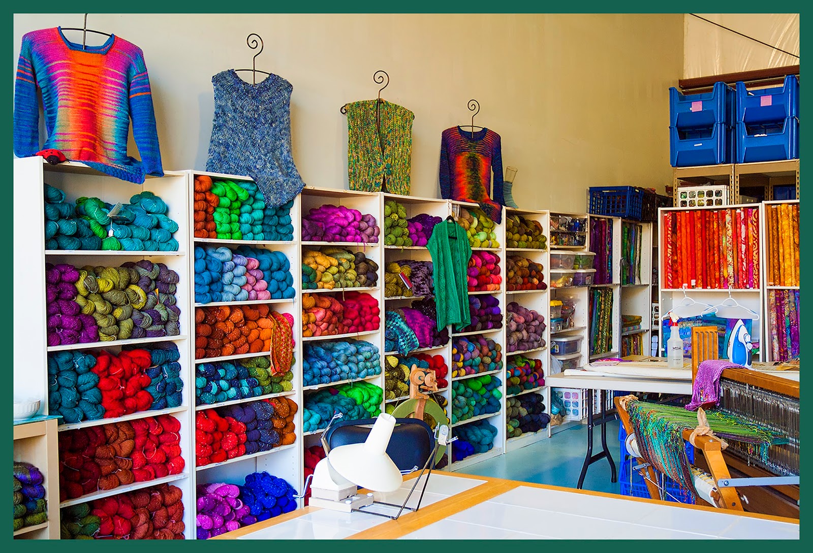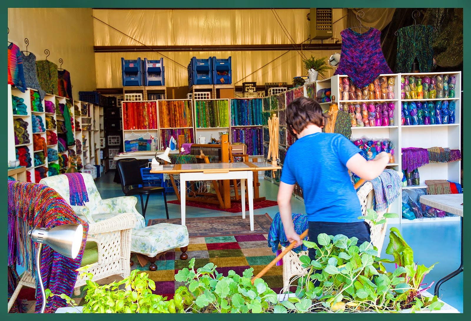 Blue Heron Yarns' new warehouse studio. We will be doing actual work here, including quilting, weaving, spinning, and indoor organic gardening. We have all of our wool, silk/wool, silk/linen yarns here plus a selection of our main line yarns. We have finished items for sale as well. Right now we are featuring knitted wool vests at 25% off the retail price. We will be open to the public Wednesdays from 10-2 or by appointment. We are just one entrance past our retail store if you are coming from Glebe Road at 8727 Brooks Drive, Easton, Maryland.