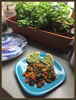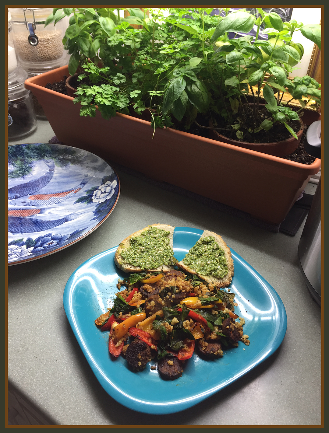 One of my kitchen planters and a delicious vegan dish with collards from my indoor garden, baby peppers, millet, and Tofurky Italian sausage. Rosemary olive bread with my homegrown basil, raw