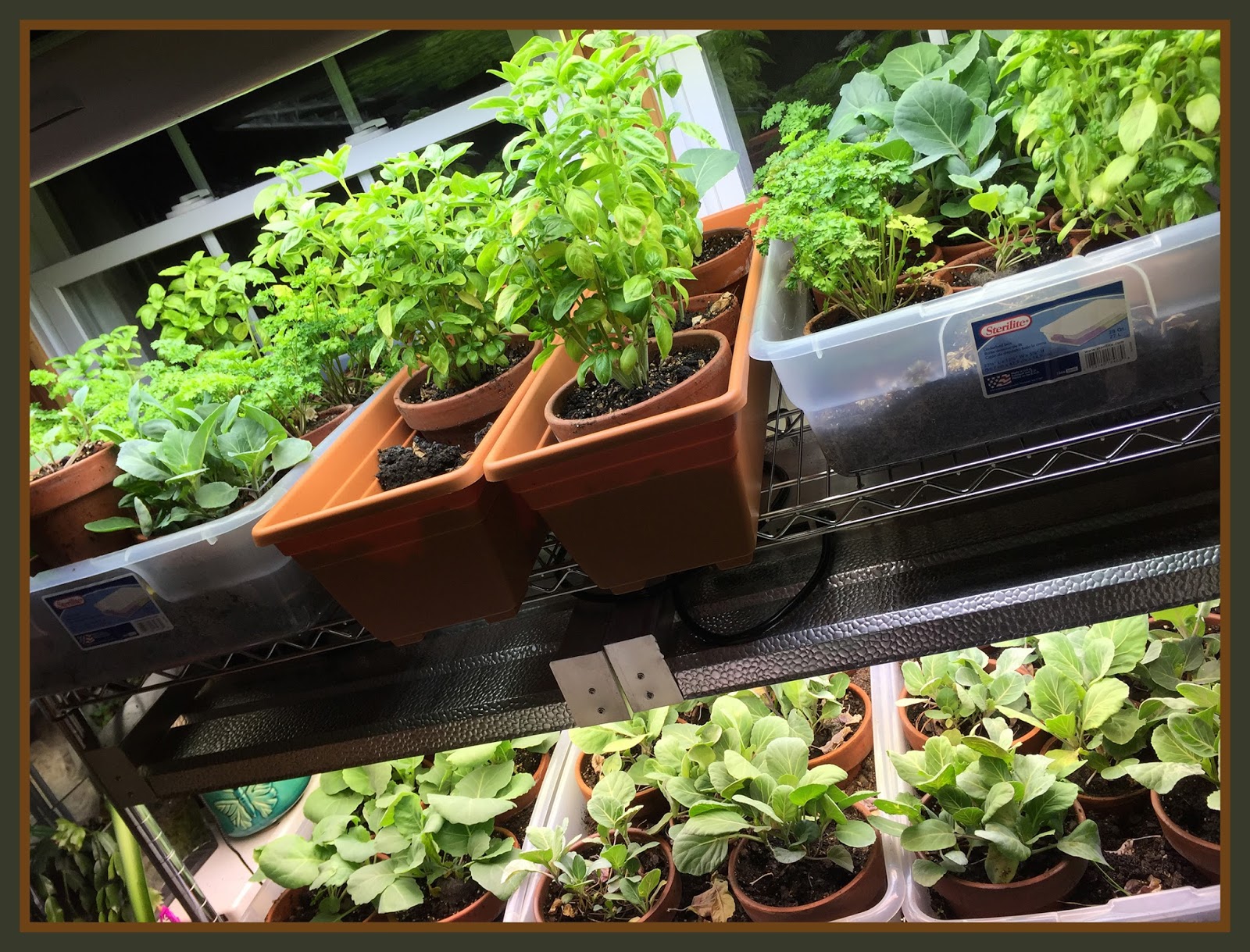 The thought of going all winter without fresh pesto and other greens was my motivation to set up for indoor gardening. I purchased some lights and set about to give it a try. There were some challenges and setbacks, searches made, and solutions found. I'm sure there will be more ahead. I have two growing areas at this time. A nursery at my bedroom window where the babies get direct southern light most of the day. I cover them at night to keep them warm. The main area is in my studio. I have two shelves of plants on a chrome shelving unit under lights. The upper 4' light has 8 bulbs and the lower one has 2 -24"/12 bulb lights. I am researching Bokachi composting and will write more about that as soon as I get under way with it. There is lots of info on my Farm/Garden board on Pinterest.